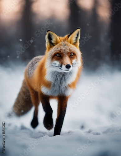 Fototapeta premium A red fox trotting through the snowy forest, twilight