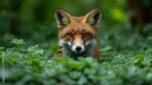 Fototapeta premium A red fox, up close, surprises among green plants in a field