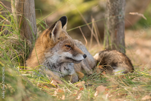 © Tim, Obraz premium A red fox (Vulpes vulpes) photographed in the dunes of the Netherlands during autumn. With autumn leaves in the foreground.