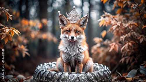 © arri, Naklejka premium A Red Fox Wearing a Crown in an Autumnal Forest