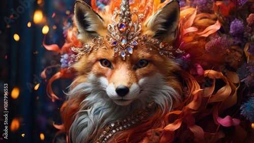 Naklejka premium A red fox wearing a crown of jewels and feathers, looking directly at the...
