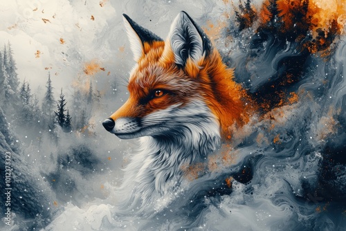© zulie, Naklejka premium A red fox with a snowy, foggy background.