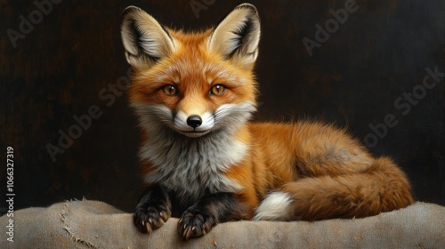 © Alienmarsh, Fototapeta premium A red fox with white chest and tail lies on a burlap sack against a dark background, looking directly at the camera.
