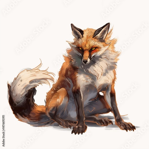 Obraz premium A red fox with white markings, yellow eyes, and visible claws sits on a white background, gazing directly at the viewer in a classic fantasy illustration.