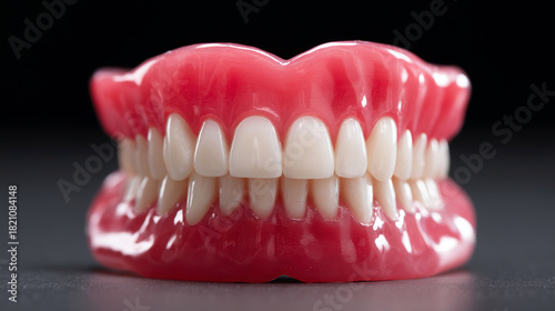 Fototapeta premium A red full-denture dental model with upper and lower artificial teeth, closed bite position. Symmetrical alignment, white acrylic teeth, glossy red gum base. Studio close-up shot,