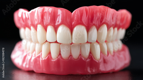 Obraz premium A red full-denture dental model with upper and lower artificial teeth, closed bite position. Symmetrical alignment, white acrylic teeth, glossy red gum base. Studio close-up shot,