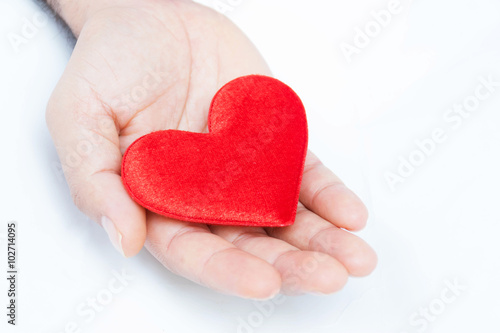 © mydegage, Fototapeta premium A red heart in hands on a white background.