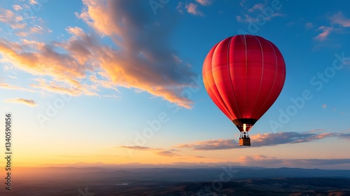 © VISUAL BACKGROUND, Fototapeta premium A red hot air balloon flying in the sky at sunset