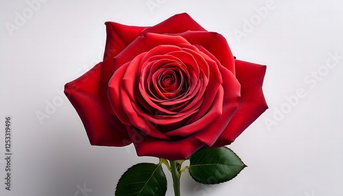 © Bibou Design, Fototapeta premium A red hybrid tea rose blooming isolated on a white background. Rose flower is symbol of love, desire, romance, and gifts for anniversaries or Valentine's Day.