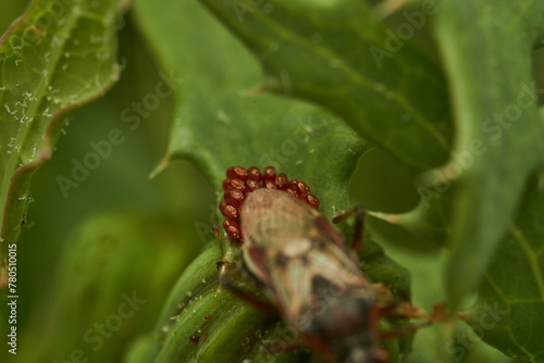 © DiazAragon, Fototapeta premium A red insect laying eggs on a green leaf