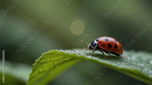Fototapeta premium A red ladybug with black spots crawls on a green leaf with dew drops.