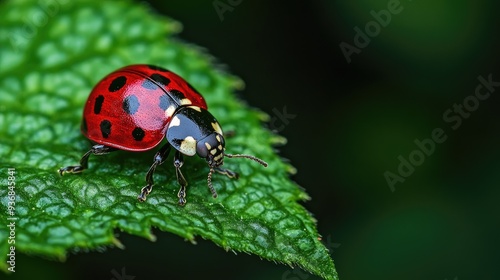 Naklejka premium A red ladybug with black spots sits on a green leaf.