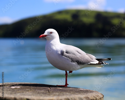 © T.Terziev, Fototapeta premium A red legged gull stands piling on the pier at Akaroa, New Zealand