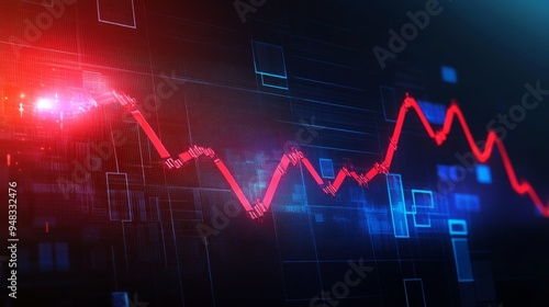 © Naru, Naklejka premium A red line graph on a dark blue background, representing a stock market downturn. The line dips sharply downwards, symbolizing a decline in financial value. The graphic highlights the volatility and p