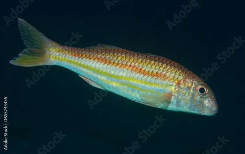 Naklejka premium A red mullet from the Atlantic Ocean swims in the night sea.