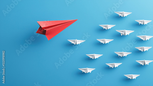© Bunny creation, Naklejka premium A red paper airplane leading white paper planes on a blue background, symbolizing leadership.