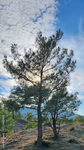 © cilicia, Obraz premium A red pine tree (Pinus brutia) silhoutte in evening
