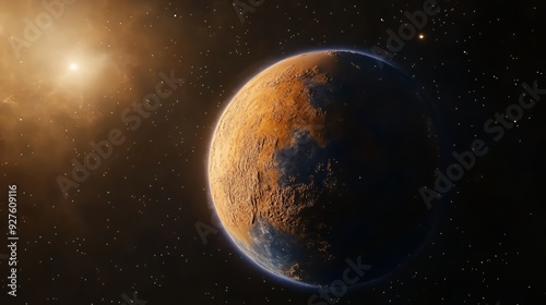 © kinara art design, Obraz premium A red planet with a sun in the distance and a starry sky.