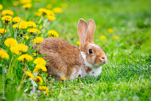 © arhat, Fototapeta premium A red rabbit sits on the grass in yellow dandelions on a sunny summer day
