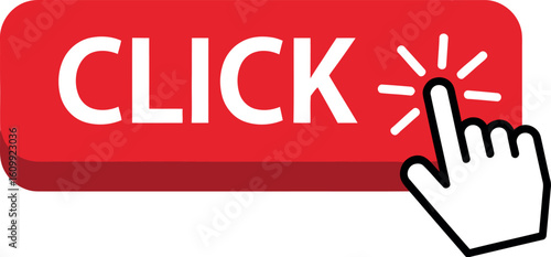 Fototapeta premium A red rectangular button with the word click and a hand cursor on a white...