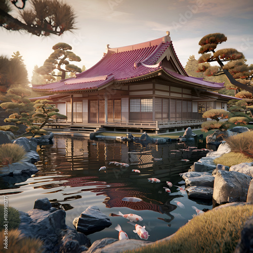 © Mahmudur, Obraz premium A Red-Roofed Japanese Home Amid Tranquil Waters and Bonsai Beauty