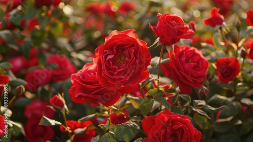 Obraz premium A red rose bush with multiple blooms, each rose at a different stage of...