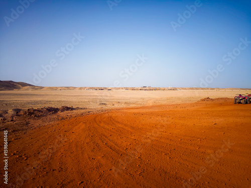 Naklejka premium A red sand path winds through a wide, flat desert – boundless freedom.