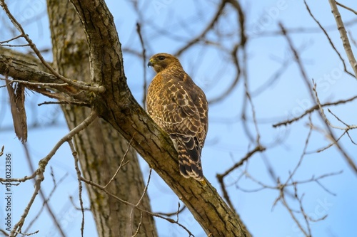 Obraz premium A Red Shouldered Hawk Perches in a Tree at Seven Lakes State Park in Holly,...