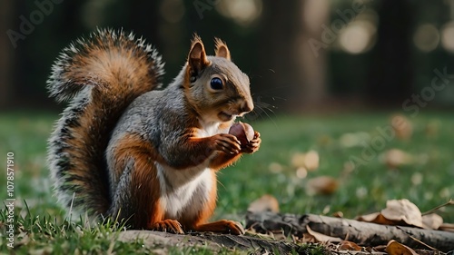 © ArsakhaDevandra, Obraz premium A Red Squirrel Holding a Chestnut in a Forest Setting