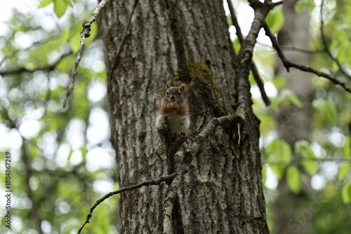 © davidphotography.ca, Obraz premium A red squirrel sits on a small branch against a tree trunk, holding food with its front paws in a forest setting.