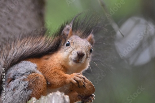 © Мария Быкова, Obraz premium a red squirrel sits on a tree in the forest and eats a nut