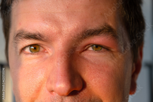 © Ольга Симонова, Obraz premium A red swollen eyelid on a man's face in close-up is an allergy to an insect bite. Allergic reaction to blood-sucking insects