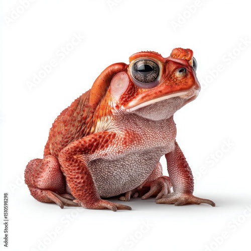 © bajita111122, Naklejka premium A red toad with large eyes sits on a white background, showcasing its textured skin and unique amphibian features.