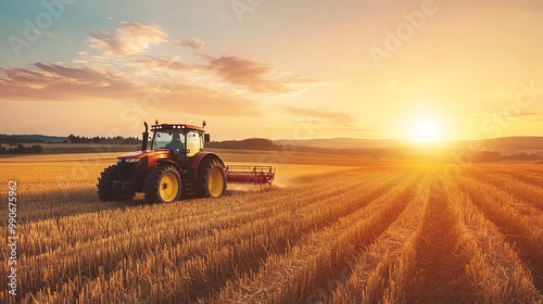 © Galib, Fototapeta premium A red tractor is driving through a field at sunset.
