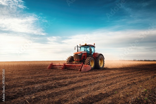© KumCup, Fototapeta premium A red tractor plowing a vast field under a partly cloudy sky.