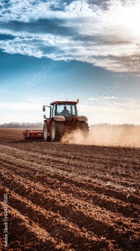 © Kitta Studio, Obraz premium A Red Tractor Tills a Field Under a Vast, Blue Sky, Dust Rising in its Wake