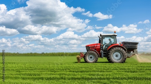 © lililia, Naklejka premium A red tractor with a rear-mounted cultivator works a field at sunset