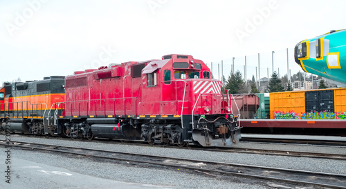 © Jesse, Obraz premium A red train sits on the tracks in a rail yard