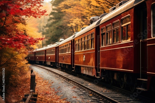 Fototapeta premium a red train traveling down train tracks next to a forest