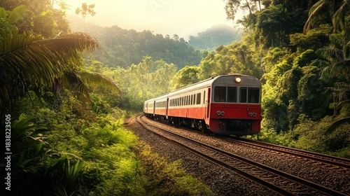 Fototapeta premium A red train travels along a railway surrounded by lush green vegetation and...