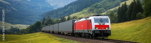 © Preeyanuch, Naklejka premium A red train travels through a lush green valley, surrounded by mountains and clear skies, symbolizing travel and adventure.