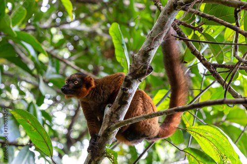 © 25ehaag6, Fototapeta premium A red Vari sits in the branches of a tree