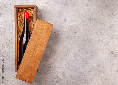 Fototapeta premium A red wine bottle elegantly placed inside a rustic wooden box