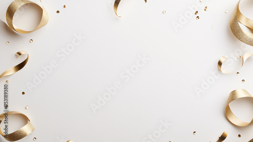 Fototapeta premium A refined and minimalistic New Year banner with a top view composition, featuring a blank white background surrounded by golden ribbons curled in graceful patterns. Subtle glitter accents are
