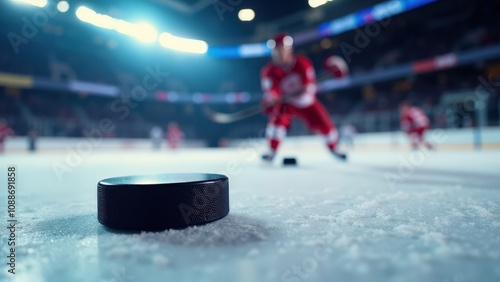 © ArtPro, Fototapeta premium A refined puck on ice wallpaper mockup showcasing a black puck in sharp focus with a skating player.