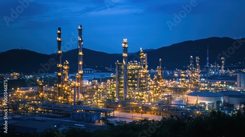 Obraz premium A refinery illuminated at night, with bright lights highlighting the complex...