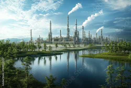Obraz premium A refinery seamlessly integrated into a natural landscape, showcasing harmony...
