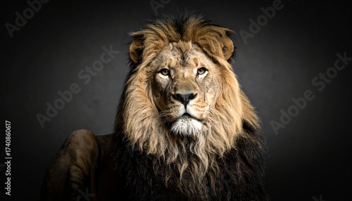 Fototapeta premium A regal lion stares forward, mane glowing with golden depth against a...
