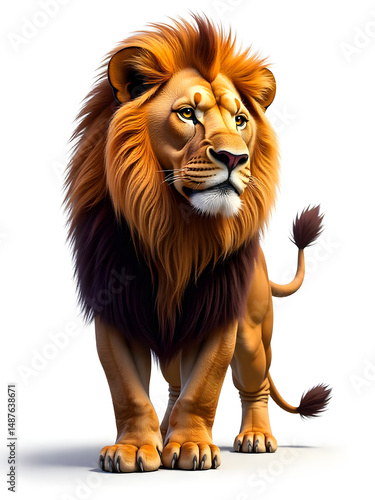 © Yasin, Fototapeta premium A regal lion with a flowing golden mane stands prominently against a pristine white backdrop.