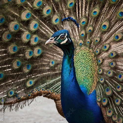 © Tariq, Fototapeta premium A regal peacock with its tail feathers spread in full glory, set against white.